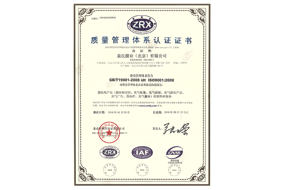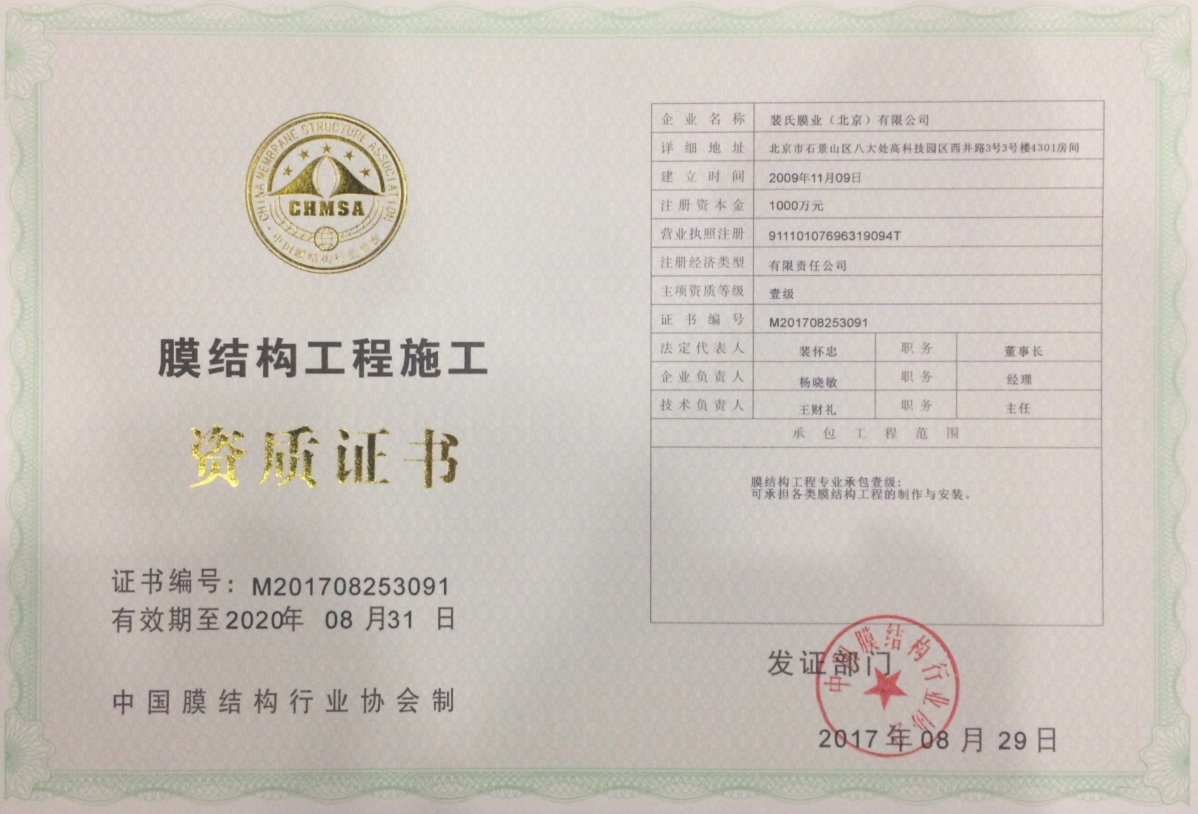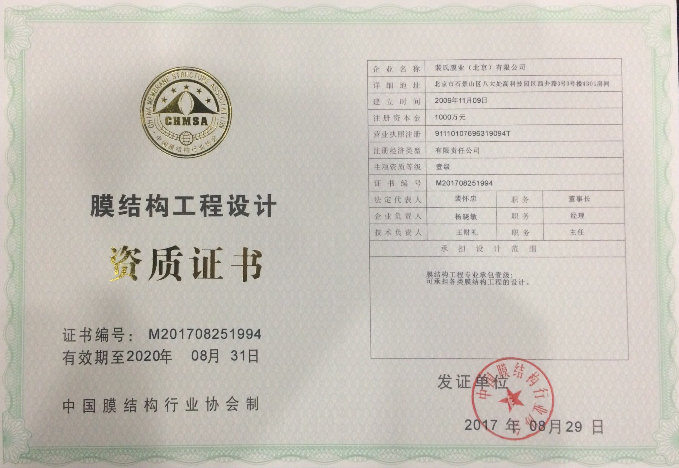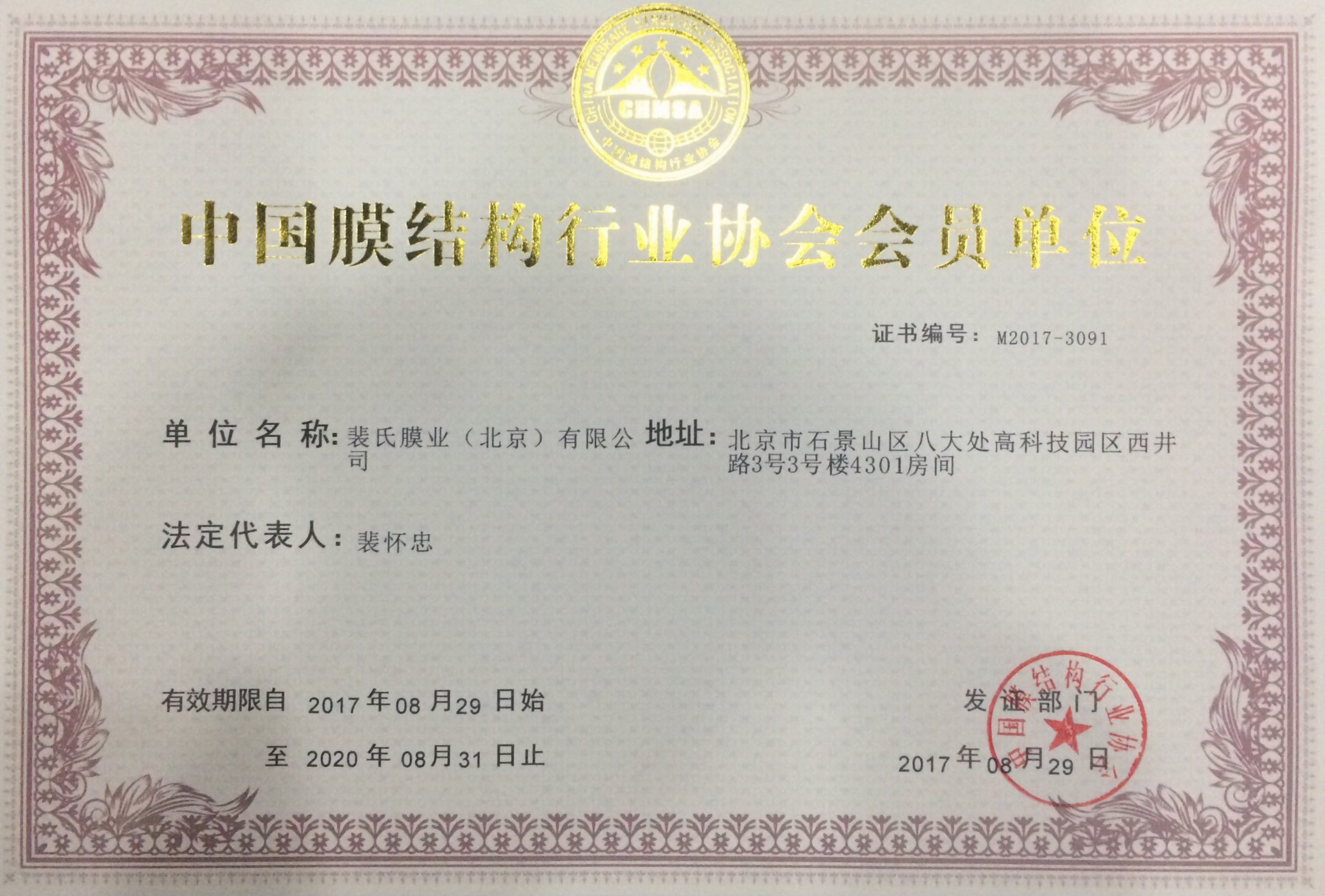 裴氏(PEISIR)膜业成立于2009年11月9日,是集膜结构产品设计研发、生产制作、销售和服务于一体的国家级高新技术企业。创始人1996年在北京完成第一例国产气承式膜结构建筑的设计安装和调试应用。裴氏(PEISIR)膜业于2010年将气承式膜结构建筑产品出口至哈萨克斯坦首都阿斯塔纳。裴氏(PEISIR)膜业有一批分工细致、管理严格、 技术成熟、装备精良的专业化技术团队和施工队伍。主要技术研发人员...