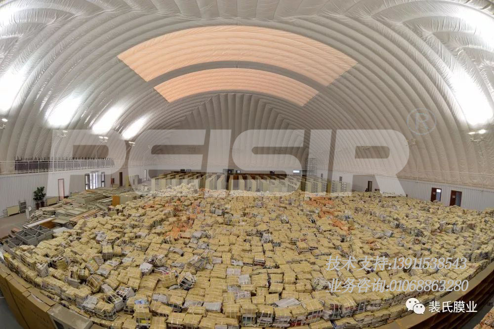 ??气膜用于仓储,拥有传统建筑无法比拟的优势,除了防水防火、恒温恒湿而外,更具备优异的密闭性、超强的防腐、防侵蚀能力,膜材本身还具有自洁性能、维护成本极低,成为仓储空间的最佳选择方案。